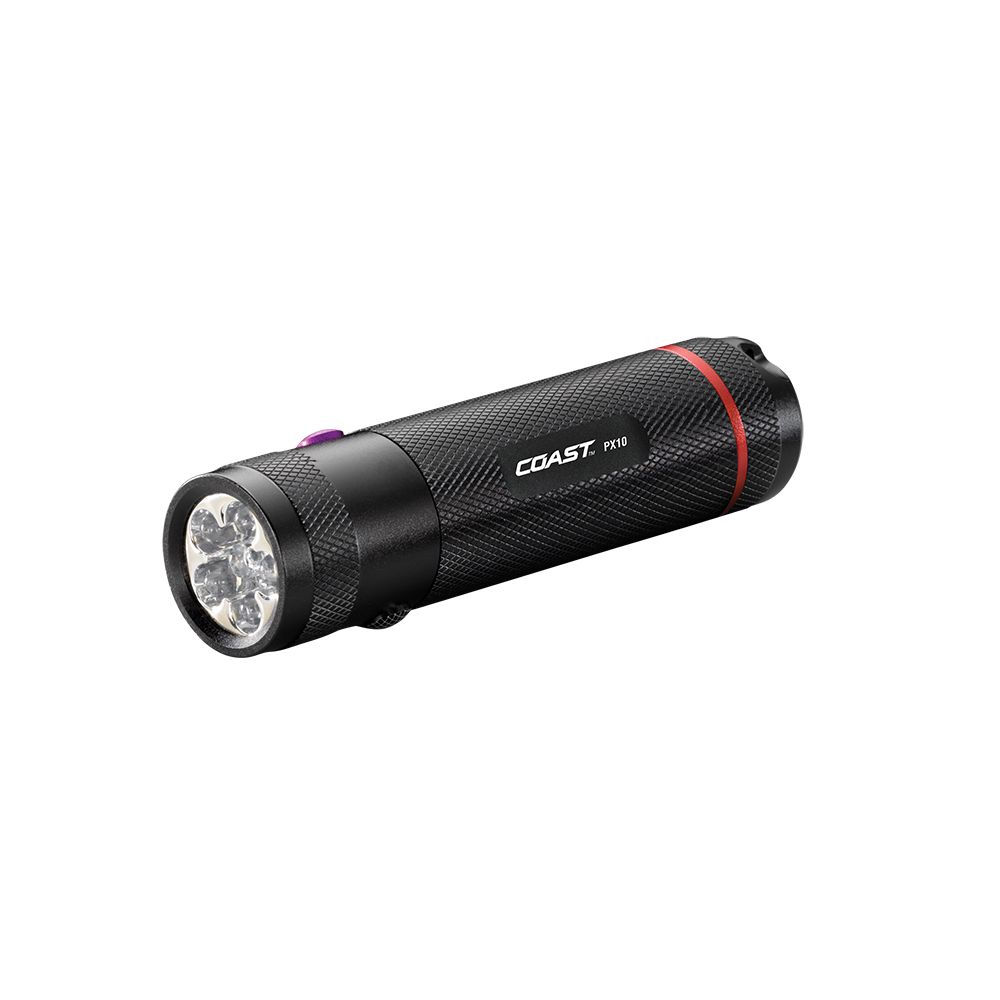 The Coast PX10 is a compact, professional use torch that can tap into a spectrum of light most other torches can't access. Using a total of six LED's; three of which craft a bright white flood beam, while the other three are UV LED's that can form into a precision spot of Ultra Violet light. The White or UV lamps are activated by an independent push button switch, saving you time cycling through the lighting modes.