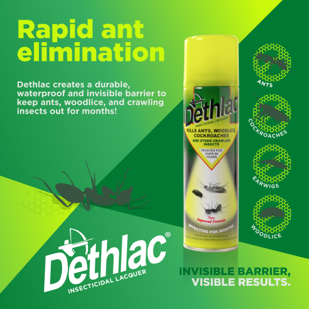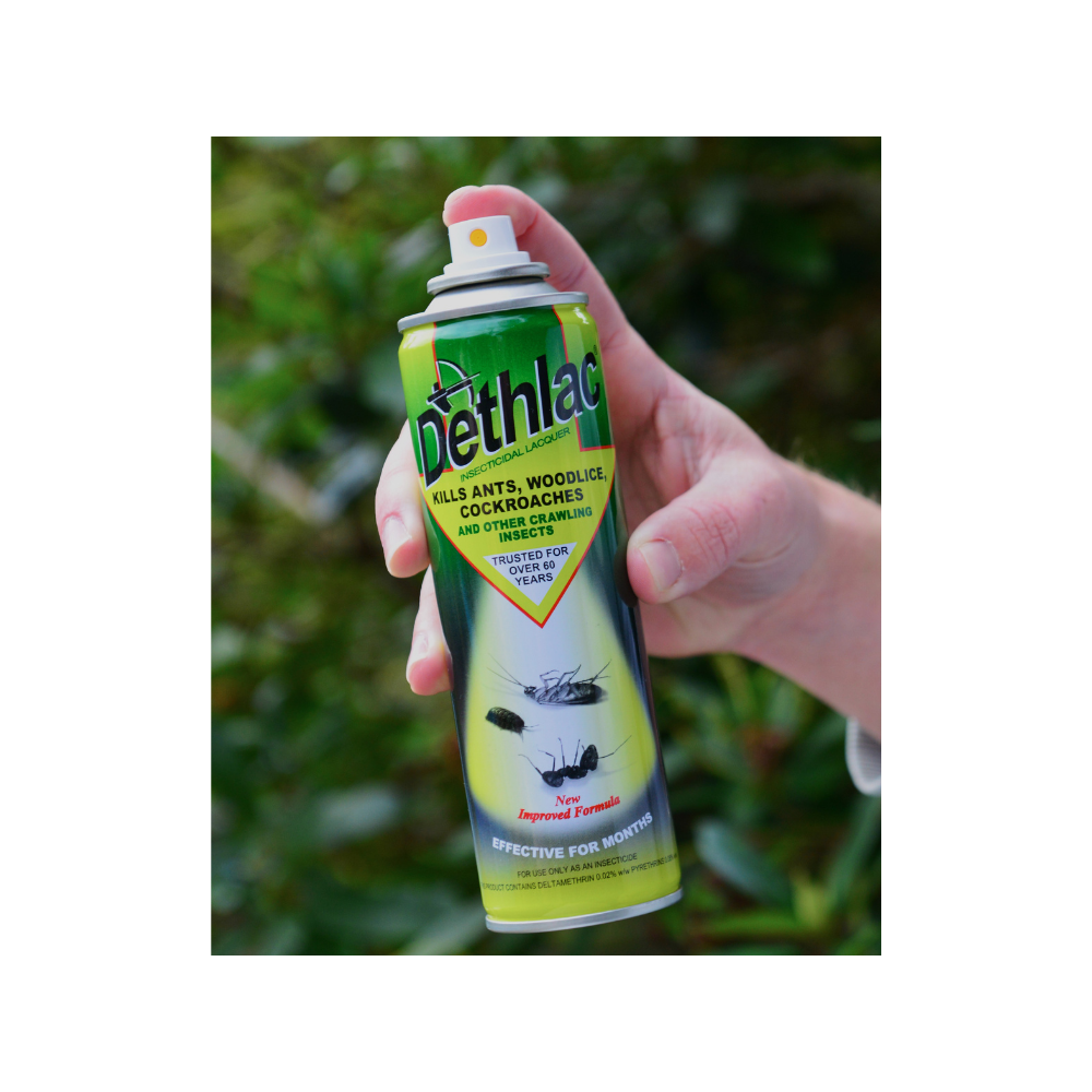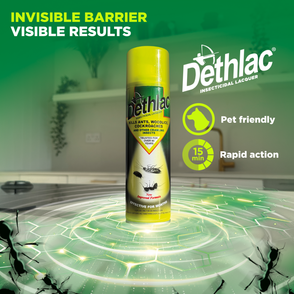 Dethlac Insecticidal Lacquer is a professional-strength insecticide spray that provides long-lasting control of ants, cockroaches, woodlice and other crawling insects. Designed for use in domestic settings, Dethlac forms a tough, invisible lacquer that dries clear and continues working for months — even after exposure to rain or routine cleaning.