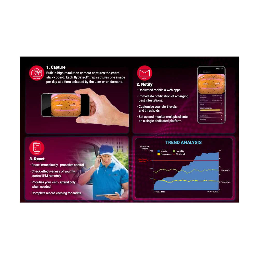 flyDetect X provides pest controllers and facilities managers with confidence, control, and clarity. By combining intelligent monitoring, zone-based oversight, and remote decision-making, it transforms fly control from routine checking into data-led management.