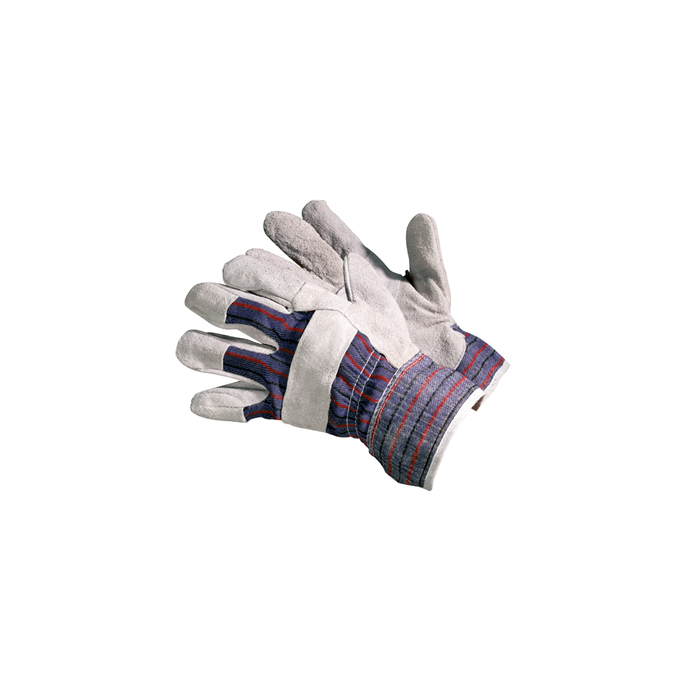 Spilt leather rigger gloves for heavy duty working. 2" reinforced cuff, incorporating vein patch and grey split leather patch palm.