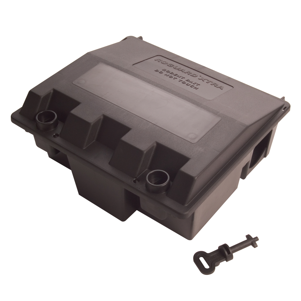 Heavy duty, tamper resistant bait box. The twin feeding chambers take all formulations. The XTRA has been designed to accommodate a rat trap. The XTRA also contains a pair of steel bait block holders which can be fixed either horizontally or vertically.