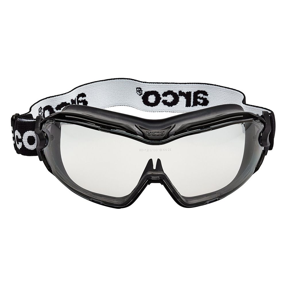 These vented safety goggles protect against impacts from flying particles of medium energy.