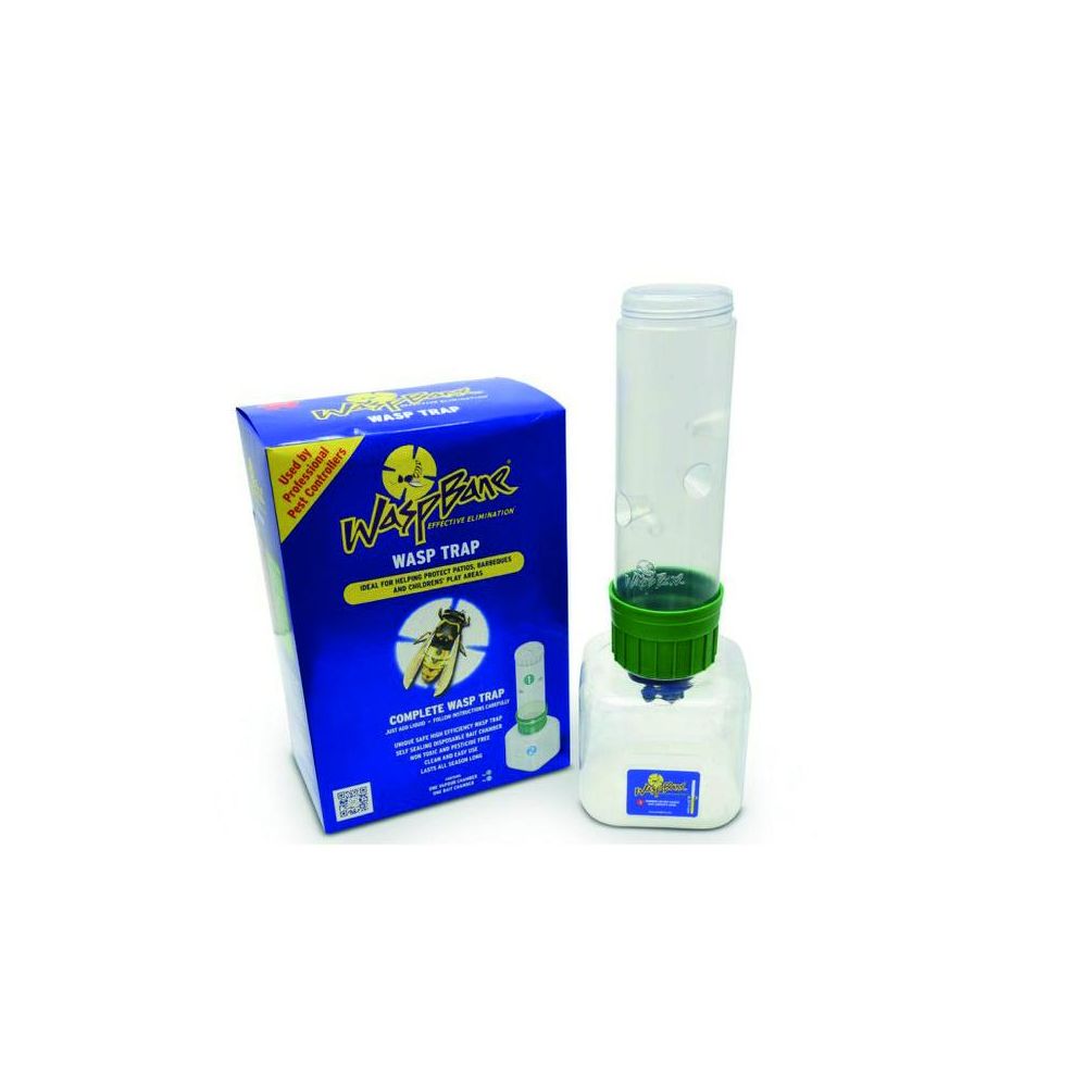 The WaspBane wasp trap is a two part trap. The bottom part is a self sealing disposable bait chamber designed to hold the bait and dead wasps. The top vapour chamber is a reusable chamber designed to attract and catch wasps. The WaspBane wasp trap has a bait system which lasts all season long which means it does not need re-baiting and needs little or no maintenance. The bait chamber is designed to be thrown away at the end of the season to be replaced with a new bait chamber the following year. The WaspBane wasp trap kills virtually 100% of all of the wasps that it catches which means that unlike other traps it does not cause swarm feeding and will not make your wasp problem worse.