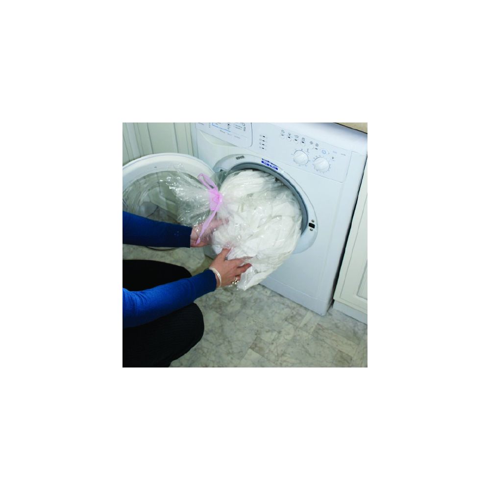 A clear laundry bag, 660mm × 840 mm, soluble in cold water and provided with a soluble strip to seal the bag tightly after placing bed linen into it. A cost effective solution to transfer contaminated / infested bed linen from the bedroom to the washer, with NO risks of spreading an infestation in the other areas of the premises during transfer. 100% soluble and biodegradable. The bag dissolves completely in cold water and leaves no plastic residues on the bed linen. We recommend a minimum water temperature of 20˚C for the wash cycles.